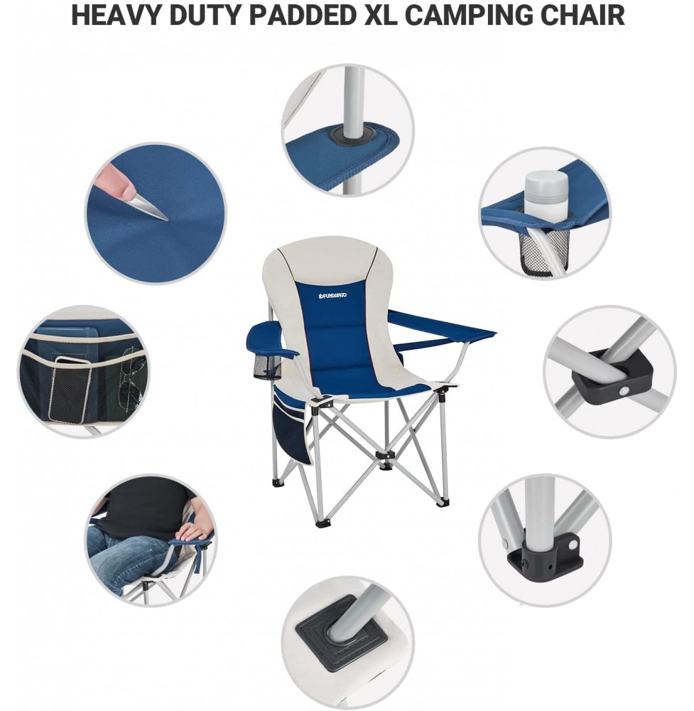 Καρέκλα κάμπινγκ βαρέως τύπου Υποστηρίζει έως και 136 κιλά/300 λίβρες. Καρέκλα κάμπινγκ κατασκευασμένη από πολυεστέρα υψηλής ποιότητας με σκελετό από χάλυβα με επίστρωση πούδρας. Ο σχεδιασμός της δομής του βραχίονα σωλήνων από χάλυβα υψηλής αντοχής καθιστά την καρέκλα πολύ σταθερή. Ταυτόχρονα λύνει θεμελιωδώς το πρόβλημα της σταθερότητας της δομής.